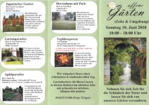Es ist inzwischen guter Brauch, dass einmal im Jahr Freunde der Gartenwelt ihre Gärten für Besucher öffnen. Auch bei uns in der Region können Sie sich von der Gartenlust anstecken lassen, wertvolle Anregungen holen, dieses und jenes Fachgespräch führen oder sich einfach an der Pracht von Blumen und Pflanzen erfreuen.