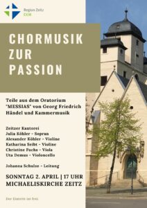 Am Sonntag, den 2. April findet um 17 Uhr in der Michaeliskirche eine Chormusik zur Passion statt. Die Zeitzer Kantorei wird dabei von einem Streichquartett begleitet. Es kommen Stücke aus dem Oratorium „Der Messias“ von Georg Friedrich Händel zur Aufführung. Die Sopranistin Julia Köhler singt Arien wie „Er weidet seine Herde“ und „Ich weiß, dass mein Erlöser lebt“.