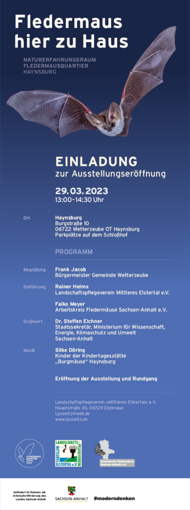 Die Ausstellung „Fledermaus hier zu Haus“ wurde in Zusammenarbeit mit dem Arbeitskreis Fledermäuse Sachsen-Anhalt e.V. konzipiert und über das Artensofortprogramm des Landes Sachsen-Anhalt gefördert.