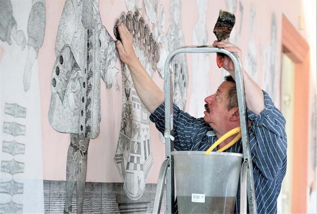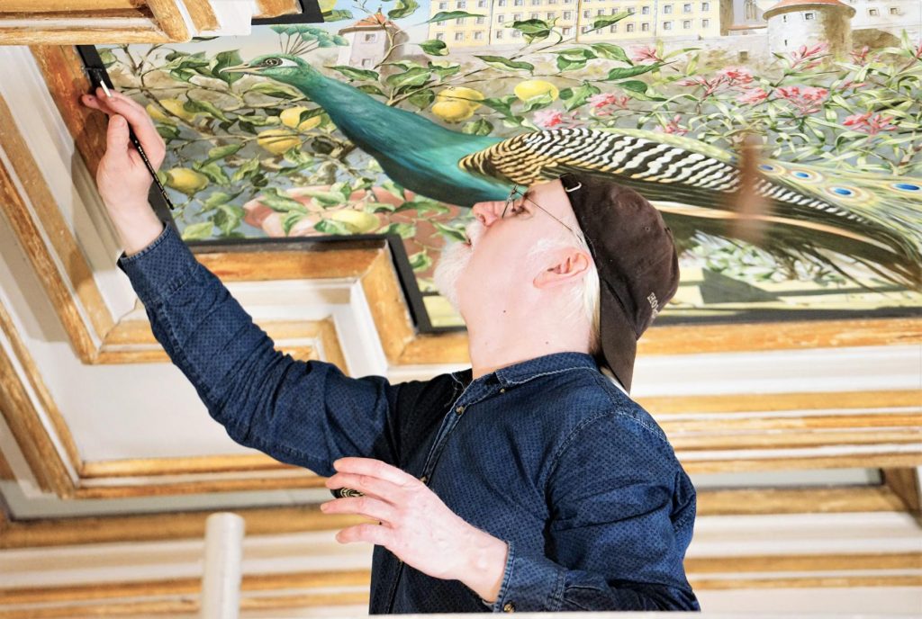 Rackwitz erschuf 9 großformatige Gemälde auf Leinwänden, die in die Kassettendecke im Audienzgemach Moritz´ von Sachsen-Zeitz eingelassen sind. Sie erzählen – ganz in barocker Tradition – von den Tageszeiten, von Tieren und Pflanzen im Schlosspark, vom Werden und Vergehen der Nebenlinie Sachsen-Zeitz. Du folgst dem Tageslauf, liest aus den Jahrhunderten in einer faszinierenden Welt aus filigranen Linien und trittst in phantastische Räume aus Farben und Formen. Rackwitz vergegenwärtigt mit großer Sinnlichkeit unsere Kulturgüter und trägt auf seine Weise dazu bei, sie zu bewahren.
