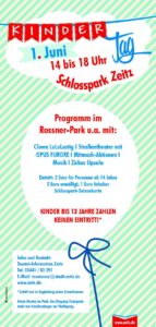 Zur Eröffnung des quietschvergnügten Festes wünschen sich die Organisatoren einen großen Kinderchor. Es wäre wunderbar, wenn alle kleinen Festgäste gemeinsam eine besondere Version des Liedes „Grün, Grün, Grün“ singen würden. Der Liedtext für das Eröffnungsprogramm ist hier zu finden: www.zeitz.de/liedtext