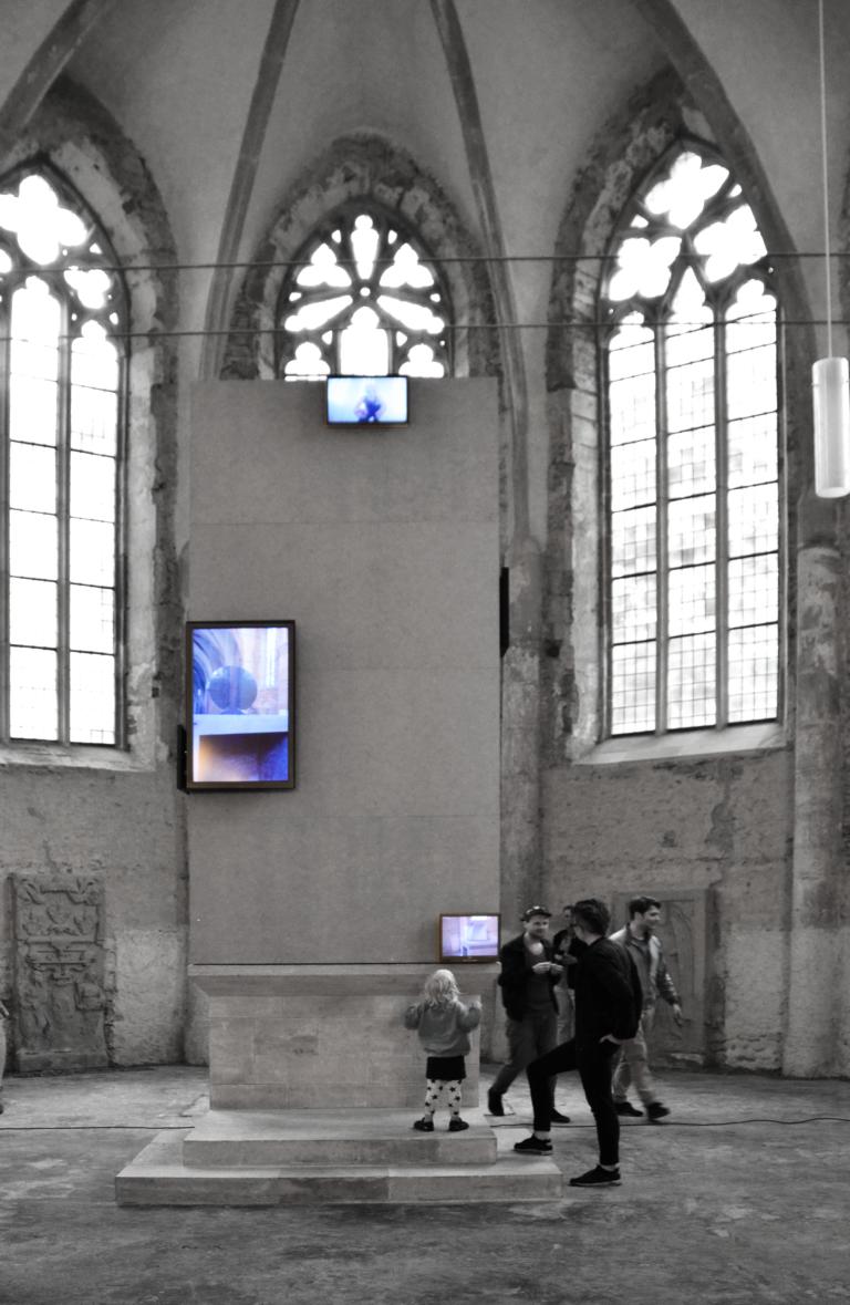 Die Studenten hatten zunächst auf dem Altar mit Installationen experimentiert. Sie nahmen diese Installationen stets in annähernd gleicher Bewegung der Kamera als Video auf. Diese Arbeiten setzten sie nach verhüllendem Überbau des Altars gemeinsam gekonnt in Szene. Sehen Sie selbst. In der Ausstellung können Sie mit StudentInnen sprechen.