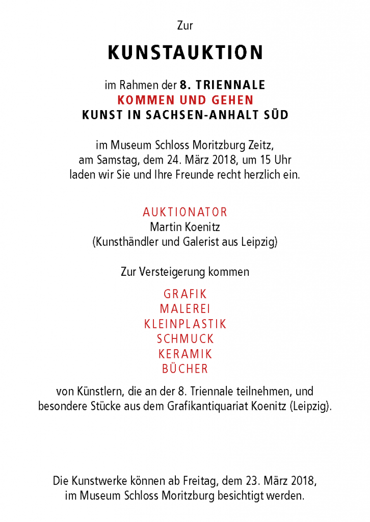 Das ist schon ganz etwas Besonderes: eine Auktion zeitgenössischer Kunst im Museum Schloss Moritzburg Zeitz. Angeboten werden Arbeiten von an der Triennale teilnehmenden Künstlerinnen und Künstlern. Zur Versteigerung kommen Grafik, Malerei, Kleinplastik, Keramik, Schmuck und Bücher.