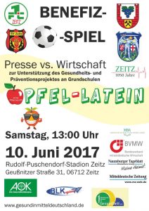 Die Feierlichkeiten zum 1050-jährigen Zeitzer Stadtjubiläum führen die Gesundheits-Netzwerker in diesem Jahr in die Dom- und Residenzstadt. Im Puschendorf-Stadion werden Vertreter der regionalen Wirtschaft gegen Vertreter der Presse im Fußball gegeneinander antreten. Veranstalter sind die Stadt Zeitz, der SV Motor Zeitz und der 1. FC Zeitz.
