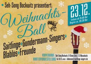 Die Kleinkunstband Saitlinge & Singers um Sänger Bernd Christen und den mittlerweile in Leipzig lebenden Schauspieler Peter Schneider ab 19.00 Uhr lädt wieder zum traditionellen „Weihnachtsball“ in die Kulturscheune nach Bockwitz bei Zeitz ein.