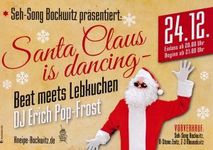Als zusätzliches Weihnachtsprogramm präsentiert die Bockwitzer Kulturscheune außerdem am Weihnachts-Dienstag (24.12.) die etwas andere Weihnachtsnacht unter dem Motto „Beats meets Lebkuchen“: DJ Erich Pop-Frost legt dann tanzbare Beats unter den Weihnachtsbaum und lädt somit zur großen X-Mas-Party. Also Weihnachtsfrauen und Weihnachtsmänner: Geschenk abliefern und dann auf in die Kulturscheune nach Bockwitz! Tickets gibt es im Vorverkauf bei B-Stone Zeitz, im Seh-Song Bockwitz oder im Z3 in Meuselwitz. Alle Infos: www.bockwitz-kneipe.de