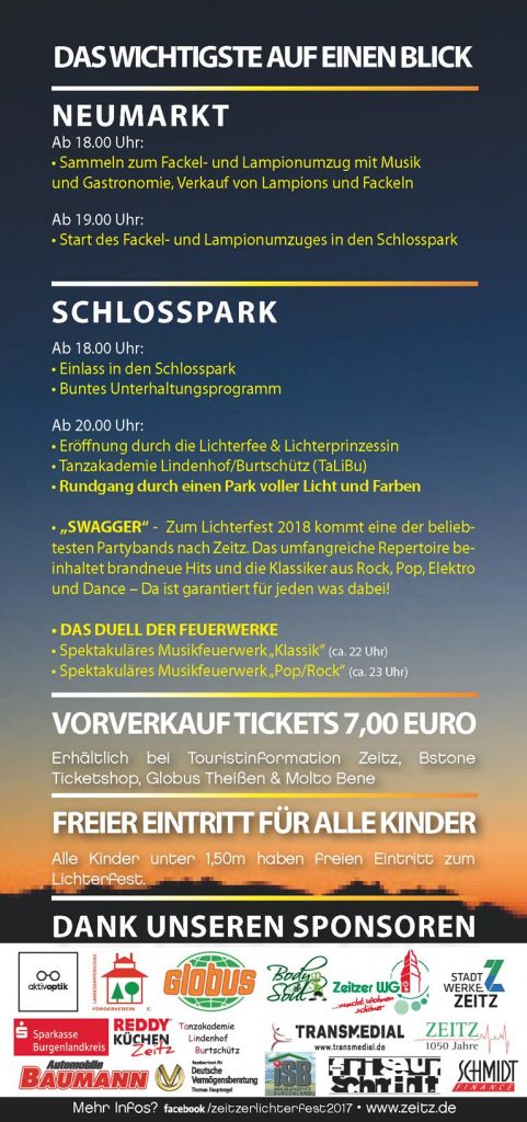 Zum vollgepackten Programm gehören dieses Jahr u.a. ein Poi-Workshop für Kinder, das Nachtschaufahren beleuchteter Schiffsmodelle, zahlreiche Lichterfiguren, die Showtanzvorführungen der Tanzakademie Talibu, Walc-Acts auf Stelzen und aufgepasst -mit der Band SWAGGER kommt eine der beliebtesten Partybands Mitteldeutschlands nach Zeitz.