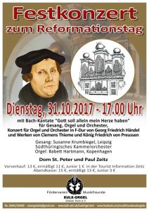 Die Orgelkonzertreihe 2017 anlässlich 1050 Jahre Zeitz, dem Reformationsjubiläum mit der Ausstellung „Bischof Julius Pflug und die Reformation“ und fünf Jahre Orgelkonzertreihe geht nun mit diesem Festkonzert am Reformationstag zu Ende.