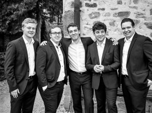 MEHRals4, das sind: Jonas Müller (Tenor), Johannes Rhode (Tenor), Sebastian Kawa (Bariton), Maximilian Kasparick (Bass) und Elias Büsching (Bass).