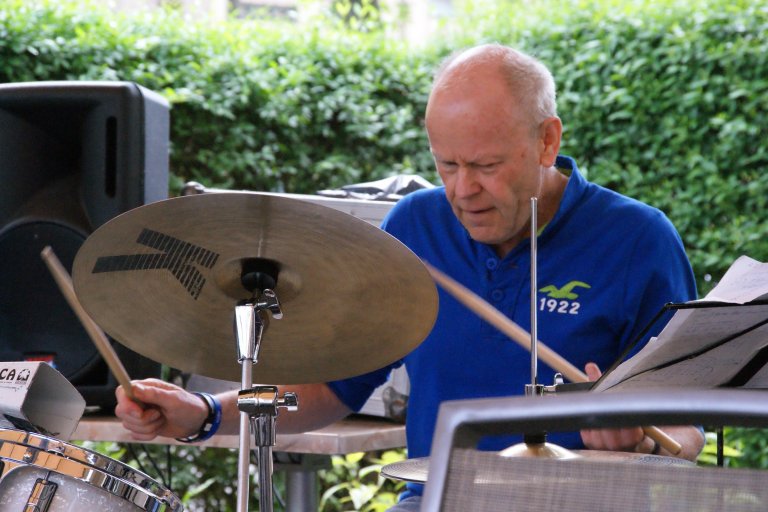 "Der Herr über Trommeln und Becken ist Jahrgang '43. In den 60er Jahren hat er die ersten Auftritte in Dixie- und Rockbands der Aachener Szene absolviert und hat es dabei bis in den legendären Hamburger Starclub gebracht. Danach hat er sich dem Jazz und dem Jazzrock zugewandt, dabei z.B. mit der WDR Bigband unter Kurt Edelhagen gespielt und in diesem Umfeld in mehreren Formationen u.a. mit dem Saxophonisten Heiner Wiberny. Es folgten Engagements in diversen Bigbands, in kleineren Jazzformationen und in einer Galaband. Seine Idole sind Steve Gadd und Ginger Baker. Seit 2010 rührt er seine Sticks bei den Hombres.