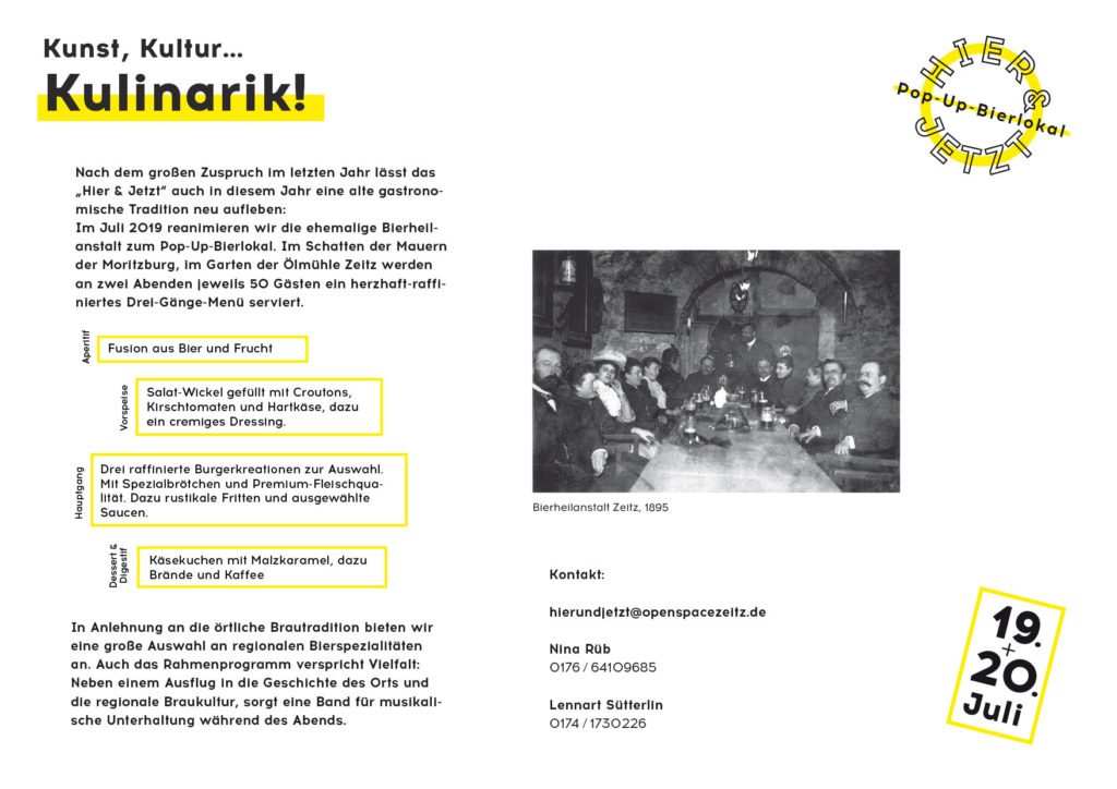 In einem Gewölbekeller der Kasematten neben der Ölmühle trafen sich vom späten 19. bis ins frühe 20. Jahrhundert die Großbürger von Zeitz. In diesem Jahr serviert das Hier&Jetzt-Team vom Kloster Posa im Schatten der Mauern der Moritzburg ein herzhaft-raffiniertes Drei-Gänge-Menü. Eine große Auswahl an regionalen und besonderen Bierspezialitäten begleitet die Speisen als Reminiszenz and die örtliche Brautradition. Neben einem Ausflug in die Geschichte des Orts und die regionale Braukultur, sorgt eine Band für musikalische Unterhaltung während des Abends.