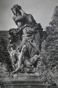 Der Neid ist gelbe ätzende Galle, die das Antlitz verwüstet, die Glieder verdirbt, das Geschlecht neutralisier. Der Neid ist eines der hemmungslosesten Werke Brauns…. der Hund, der sich erschrocken unters vorgeschobene Knie duckt, blendend eingebundenes Kompositionselement …“