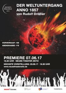 "Dass es auch schon früher immer wieder Leute gab, die auf clevere Hochstapler und erfindungsreiche Gauner leichtgläubig hereingefallen sind, zeigt das humorvoll-spritzige Theaterstück des Zeitzer Autors und Historikers Rudolf Drößler, das das Neue Theater Zeitz im Rahmen der Festwoche zum 1050. Jubiläum der Stadt Zeitz am Mittwoch, dem 7. Juni, um 19.30 Uhr zur Premiere bringt. Während der ersten Hälfte des Jahres 1857 wächst in Europa lawinenartig die Furcht, ein riesiger Komet würde auf die Erde zurasen, am 13. Juni mit ihr zusammenstoßen und das Ende unseres Planeten besiegeln. Auch in Zeitz breiten sich damals, vor 160 Jahren, Angst und Entsetzen vor der drohenden Katastrophe seuchenähnlich aus. Ein Erdbeben wenige Tage vor der befürchteten Vernichtung heizt die Verzweiflung noch heftig an. Sie erreicht in den späten Abendstunden des 12. Juni ihren Höhepunkt… Diese turbulenten Ereignisse greift Drößlers Gaunerkomödie in einer frei erfundenen Handlung auf. Sie erzählt von Menschen, die in panischer Angst versuchen, alles für ihre Rettung zu tun, und dabei zu einer leichten Beute von Betrügern werden.