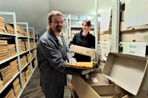 Es ist zwar noch ein Stück hin, aber Sven Lautenschläger und Chris Straßburger haben alle Hände voll zu tun. Wenn 150 Tonnen Archiv- und Kulturgut umziehen, dann ist das kein Spaziergang. Sichten, umzugsfähig verpacken und signieren – schließlich soll das wertvolle Gut aus der Moritzburg heil im neuen Gebäude ankommen. Und dort schnell wieder einsortiert werden. Eine Kernerarbeit. Zumal es das tägliche Geschäft ja auch noch gibt, wenn auch mit Einschränkungen.