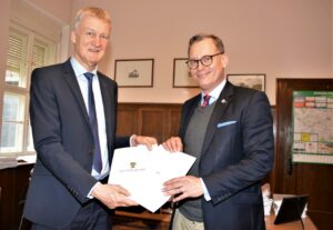Eine üppige Summe verbirgt sich hinter den drei Fördermittelbescheiden, die Thomas Pleye heute an Oberbürgermeister Christian Thieme übergab.