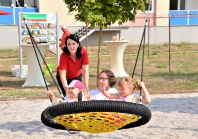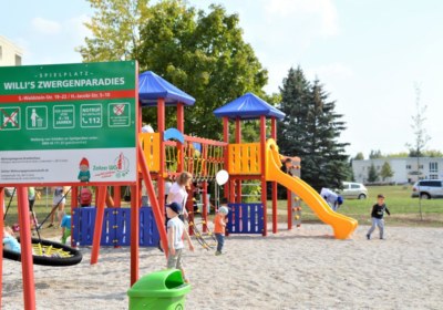 Als Willi kommt haben die Kinder die schmucken neuen Spielgeräte längst in Besitz genommen. „Willi“ ist das Maskottchen der Zeitzer Wohnungsgenossenschaft e.G (Zeitzer WG).. Die hat heute in Zeitz-Ost mit einem kleinen Fest den neuen Spielplatz seiner Bestimmung übergeben. Willi, das Maskottchen verteilte nicht nur Süßes an die Kinder, er musste auch mit seinem Namen herhalten. „Willi’s Zwergenparadies“ haben sie den Platz getauft.