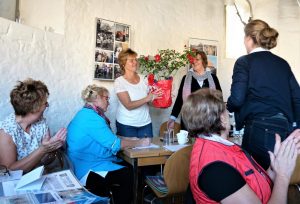 Nach dem Eröffnungsempfang zum Zuckerfest ist dies heute die zweite Begegnung mit der „Lippischen Rose“. Sonst kennen wir sie aus dem Stadtwappen der Partnerstadt Detmold und anderen Gemeinden Nordrhein-Westfalens. Heute begegnet uns die Schöne als Dankesgruß in Form einer kleinen Staude im Steintorturm. Mitgebracht hat die zauberhaften Blüten Christ-Dore Richter.  Sie ist 1. stellvertretende Bürgermeisterin Detmolds und bedankte sich mit den Geschenken bei aktiven Mitgliedern des Partnerschaftsvereins Detmold-Zeitz e.V.. Der traf sich heute (13.10.) zu seiner Jahreshauptversammlung. Und noch ein Geschenk brachte Richter mit: die Stadtwerke Detmold spenden einen deftigen Betrag zur Sanierung der in die Jahre gekommenen Küche im Steintorturm.
