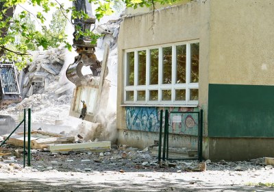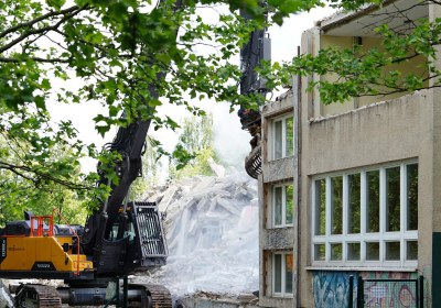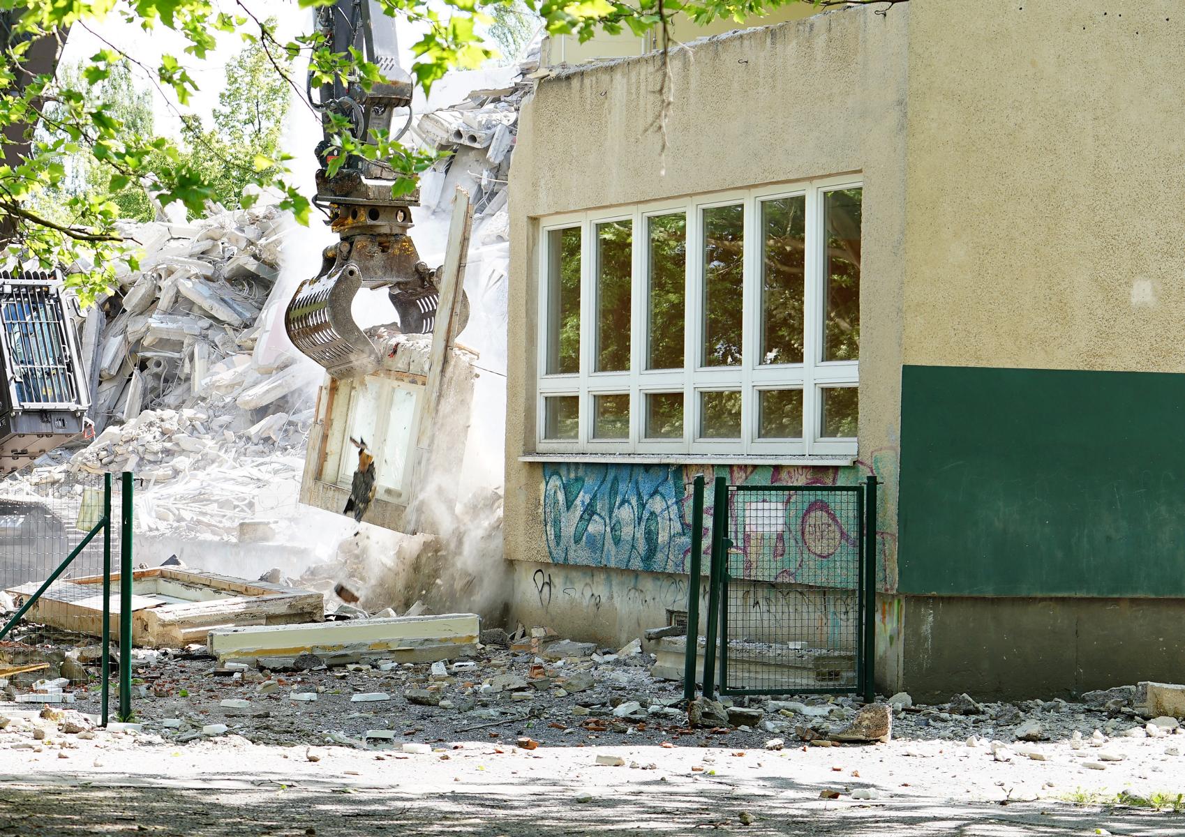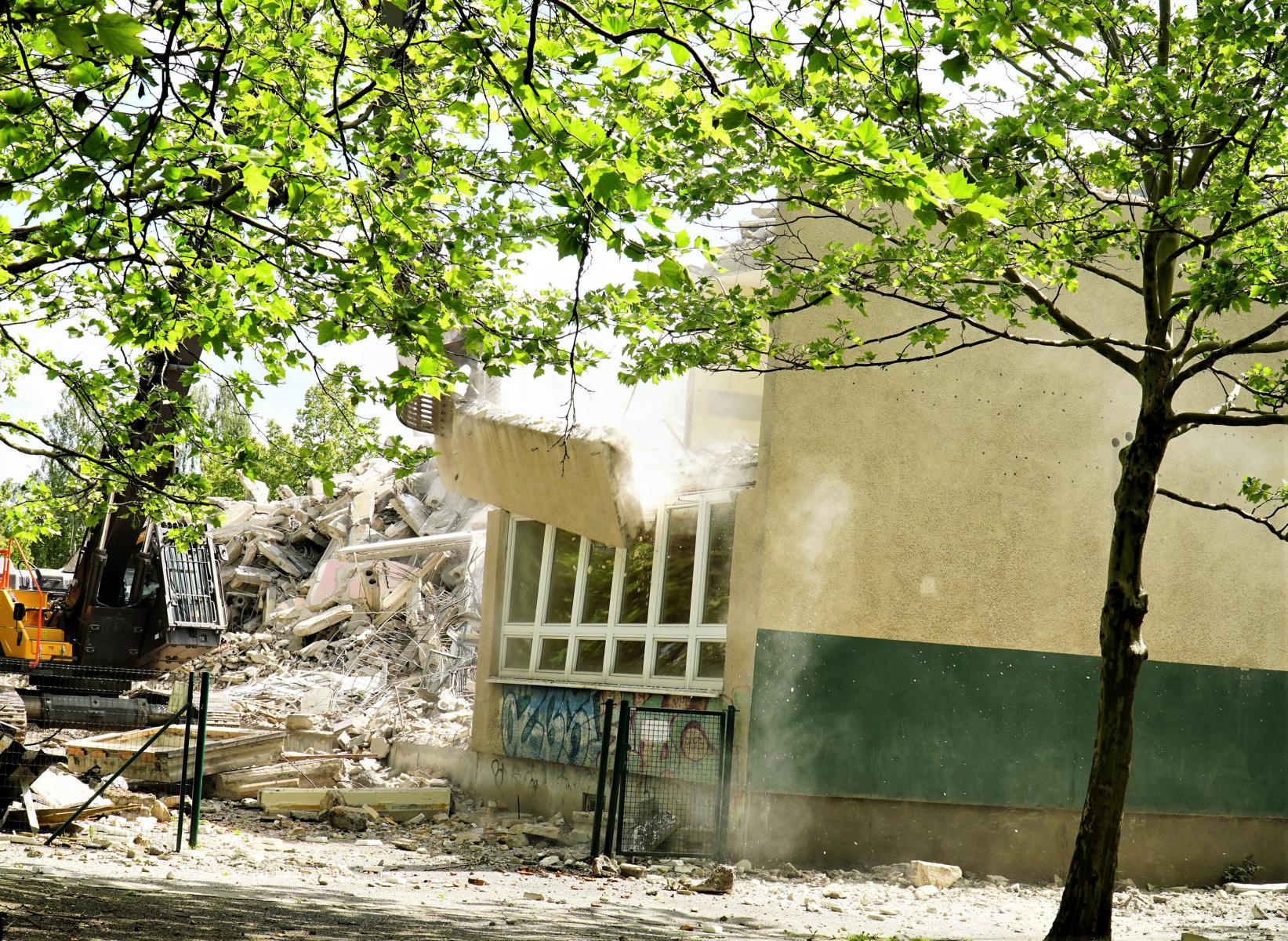 Die einstige 12. POS ist Geschichte. Buchstäblich verschwand Sie und liegt nun auf dem Trümmerhaufen der Geschichte. Samt ihrer Geschichten. Immerhin gingen meine beiden Kinder hier zur Schule. Heute liegt dort die Schule in Trümmern. Ja ja, der Lauf der Geschichte, das Alte geht, etwas Neues kommt. Trotzdem, ein bisschen Wehmut darf mal aufkommen. Das letzte Zimmer wird demontiert. Erinnerungen kommen auf an lustige Gruppennachmittage, an Diskussionen im Elternbeirat, als das Blut auf den Schürfwunden an den Knien gestillte werden wollte, an Einschulungen, Zeugnisübergaben und Abschlussfeiern. Nun der Bagger, der das letzte Zimmer auf den Trümmerhaufen der Geschichte räumt.