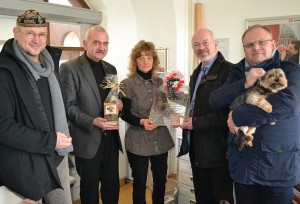 Da die Vertreter der Reiseagentur A-Z leider nicht an der offiziellen Verleihung im Schloss Moritzburg teilnehmen konnten, erfolgte die Übergabe nachträglich am 19. Februar 2016 auf dem Zeitzer Bahnhof durch Oberbürgermeister Dr. Volkmar Kunze (2.v.r.) und Roland Lindner (l.) sowie den Landtagsabgeordneten Arnd Czapek (r.). Astrid Zausch (M.) und Detlef Beer (2.v.l.) freute es ebenso wie Hund Ben (in den Armen von Arnd Czapek).