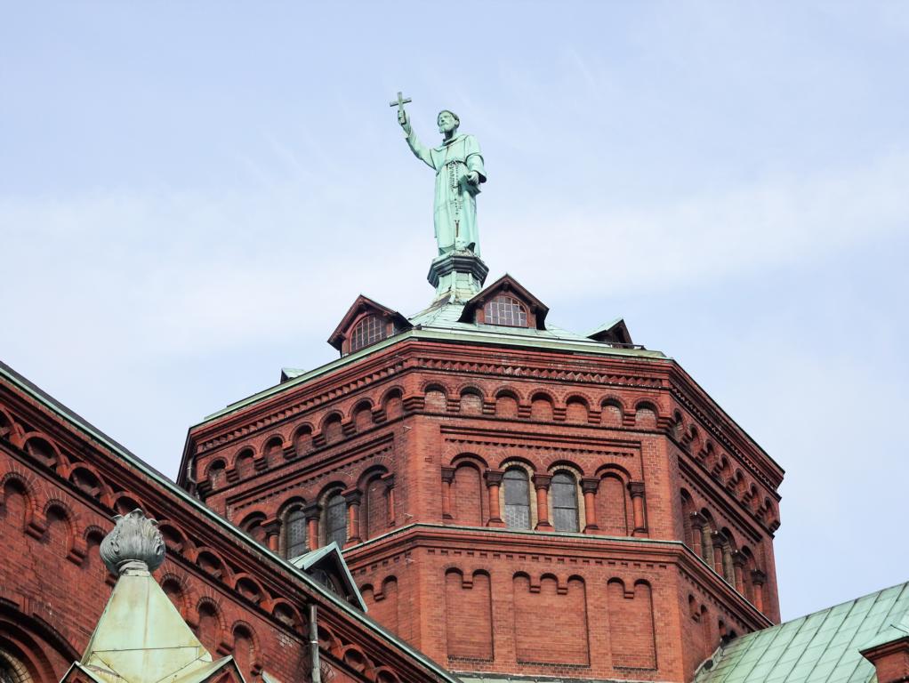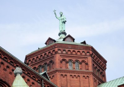 Es ist bereits stockfinster rund um die Franziskanerkirche der Panewnica Gemeinde in Katowice. Ein Scheinwerfer weist dem Kran-LKW den Weg. Im Huckepack die Glasarche 3, auf dem Hänger die eichene Hand, die sie tragen wird am nächsten Morgen.