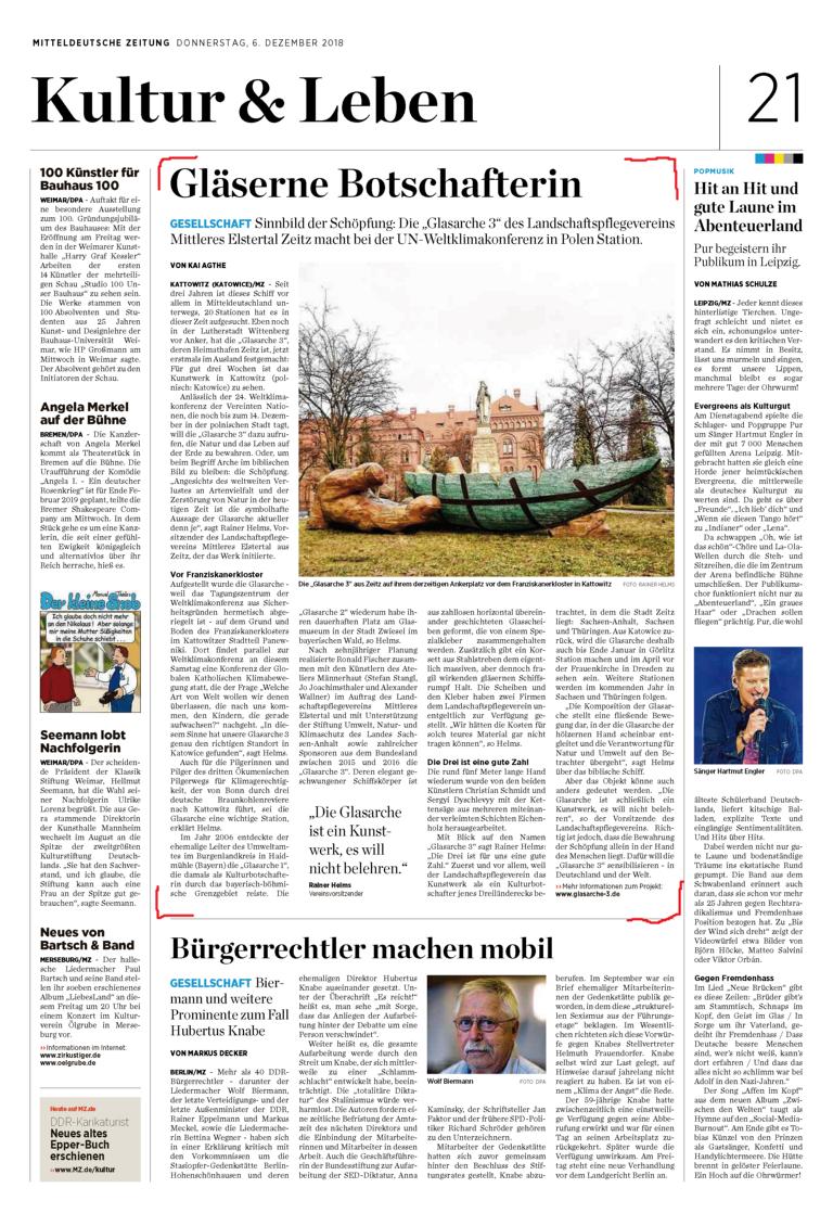 Ihr Heimathafen ist Zeitz. Von hier aus trägt sie ihre Botschaft von der Bewahrung der Schöpfung durch die Lande. Hier in Zeitz wird ihre Reise irgendwann enden. Spätestens dann wird man in Zeitz begriffen haben: Glasarche 3 ist auch eine Botschafterin für Zeitz.