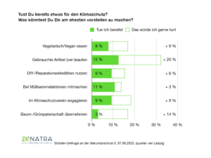 Knapp über die Hälfte (51%) kann sich vorstellen, mehr für den Klimaschutz zu tun, dabei liegt „Secondhand einkaufen“ mit 20% alle Befragten deutlich vorne, gefolgt von Mithilfe bei der Grünpflege/Grünpatenschaften mit 14%. Letzteres zeigt vielleicht ja eine neue Zielgruppe für das Baumpatenprogramm der Stadt Zeitz.