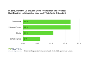 Als Treffpunkte mit Freundinnen und Freunden nannten jeweils 17% den Goethepark und den eigenen Garten und 6% der Schützenplatz, vereinzelt wurden auch Edeka, Rossmarkt und Bahnhof genannt. 11% gaben an, ihre Freundinnen und Freunde hauptsächlich digital zu treffen.
