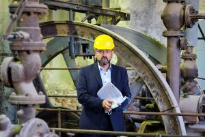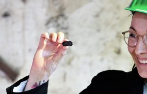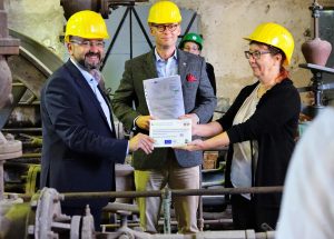 Anik Salzmann hält einen der begehrten Winzlinge hoch, ein Brikett, gepresst mit der Minibrikettpresse in der ältesten aus der ersten Generation noch erhaltenen Brikettfabriken der Welt. Im industriegeschichtsträchtigen Pressenhaus ist das Pressen dieser Minibriketts eines der touristischen Highlights des Herrmannschachts. Zur Zeit mit Einschränkungen, weil die Zeit deutliche Spuren hinterließ, sodass Bereiche für BesucherInnen gesperrt werden mussten. Das wird sich nun ändern, denn es gibt Geld für dringend notwendige Ertüchtigungsarbeiten.