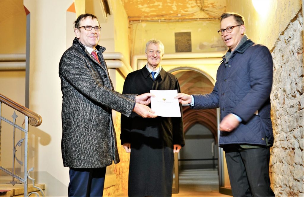 Foto links: Pfarrer Michael Bartsch, Thomas Pley, OB Christian Thieme; Abb. rechts: Architekten Gildehaus.Partner, Weimar