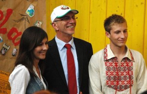 Bei der Vorstellung der Heimatländer auf handgemachten Präsentationstafeln musste denn auch Sozialminister Norbert Bischoff als Model herhalten. Um das Handgelenk ein Freundschaftband, in der Hand eine Matrjoschka und auf dem Kopf ein belorussisches Basecap. Minister Bischoff, der später das Eurocamp mit OB Volkmar Kunze eröffnet, nahm es mit einem sympatischen Lächeln und freundlichen Worten hin. Schließlich ist das EUROCAMP eine vom Land ins Leben gerufene Initiative und wird bereits zum 21. Mal eröffnet. Eine schöne Tradition.
