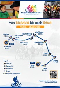 Die 26. Regenbogenfahrt führt vom 18. – 25.08.2018 von Bielefeld nach Erfurt, mit Zwischenhalten in Bad Oexen, Hildesheim, Braunschweig, Wolfsburg, Magdeburg, Halle, Leipzig und Jena.