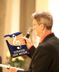 Im Rahmen des Festkonzertes heute im Dom übergab Daniel Schad das emaillierte Straßenschild mit dem Logo „Straße der Musik“. Gudrun Hartmann, 1. Vorsitzende Förderverein Musikfreunde EULE-Orgel Zeitzer Dom e.V., nahm es höchst erfreut und auch zurecht entgegen. Denn ihr Verein zaubert seit Jahren mit der Euleorgel-Konzertreihe wunderbare Musik in die heiligen Hallen und trägt so wesentlich zur Pflege der Musiktraditionen bei.
