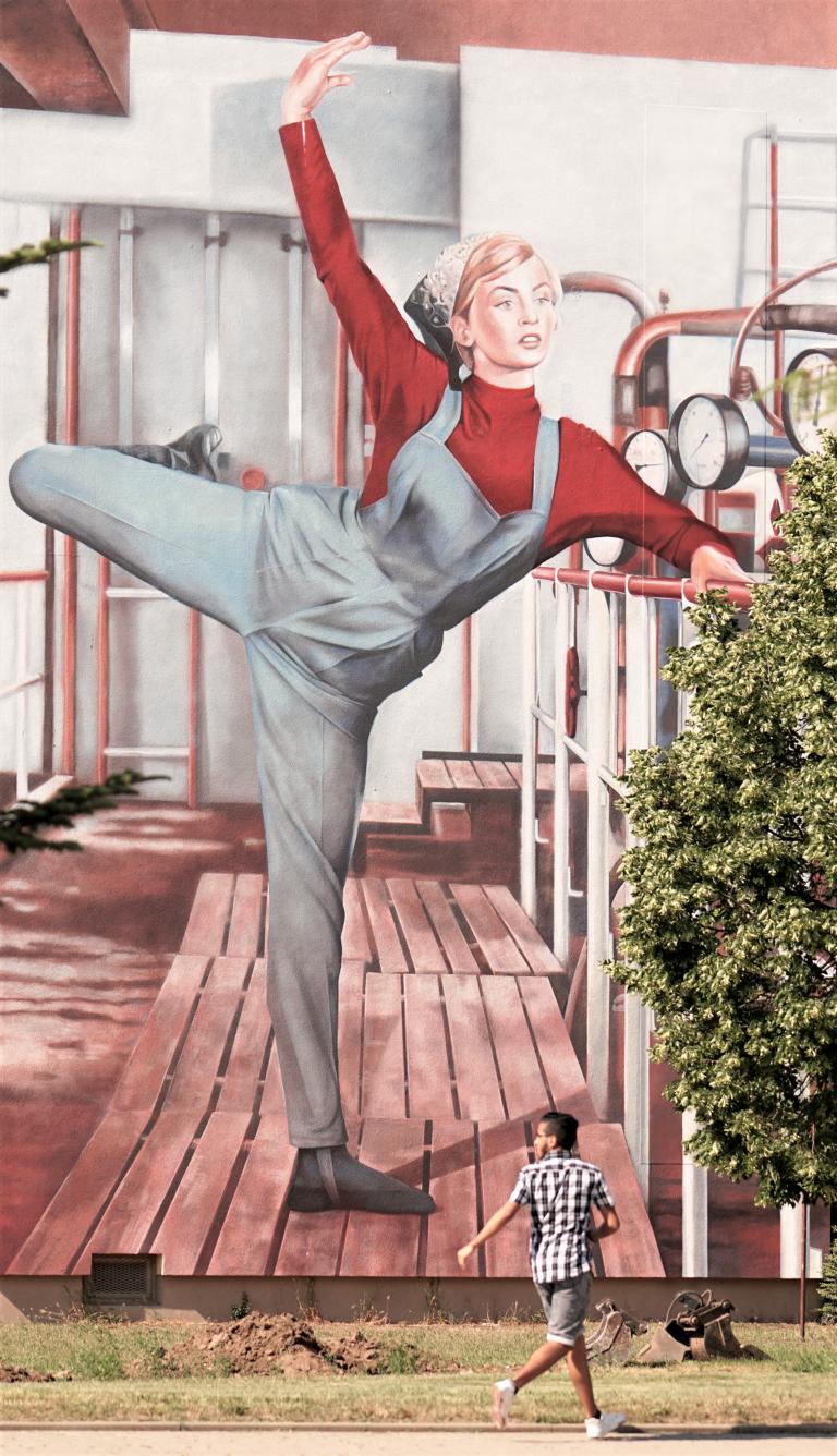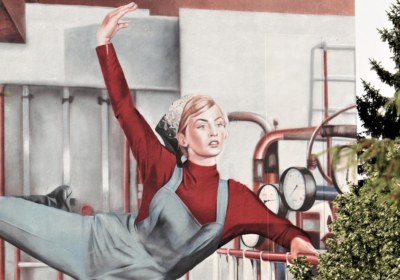 Das Bild ist ein Setfoto aus dem Spielfilm „Silvesterpunsch“(1960) von Regisseur Günter Reisch, eine Fortsetzung von „Maibowle“. Es zeigt eine Tänzerin als Arbeiterin in einem Chemiewerk. Der kreative Schöpfer Mensch steht hier als Künstler im Mittelpunkt – wie in zahlreichen Werken sozialistischer Kunst – und wirkt gar wie eine Statue. Die zahlreichen DEFA-Filme haben sich nicht nur in das kollektive Gedächtnis von Millionen Menschen, sondern ihre Stilistik und Ästhetik zugleich in die Filmgeschichte eingeschrieben. Dank der DEFA-Stiftung konnten wir das Foto verwenden, das allerdings nur einen Ausschnitt des Originalfotos zeigt.