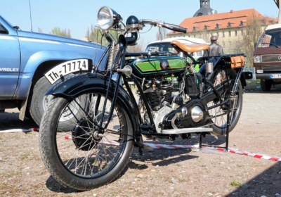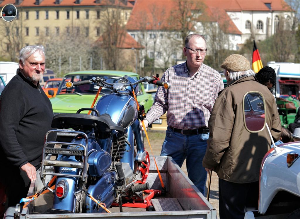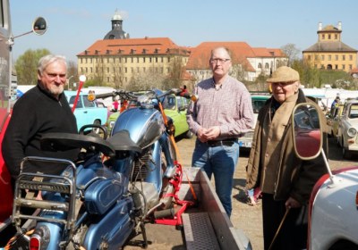 Noch steht sie festgezurrt auf dem Hänger beim Oldtimertreffen am Schlosspark. Die NSU MAX Spezial, Baujahr 1955, aus der Sammlung Hoevel wird am Nachmittag den Standort wechseln. Es wird als Leihgabe das Motorrad- und Technikmuseum auf der Haynsburg bereichern.