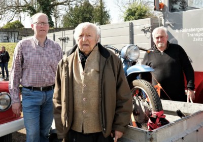Stadtrat Andreas Exler, Udo und Andreas Hoevel präsentieren für uns das gute Stück. 1955 hatte die Firma Hoevel das spezielle Gefährt an die Arnsberger Feuerwehr ausgeliefert. Es kam dort als Meldemotorrad zum Einsatz. Und 1978 kam es gemeinsam mit einer NSU LUX zur Familie Hoevel zurück. Mit der Leihgabe nach Haynsburg soll die Zusammenarbeit vertieft und verstetigt werden.