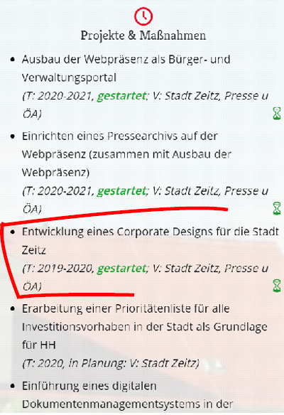 - Bestandteil des Leitbildbeschlusses ist der Maßnahmekatalog zur Umsetzung des Leitbildes. Der enthält im Schwerpunkt „Politik und Verwaltung“ den klaren Auftrag an die Verwaltung zur „Entwicklung eines Corporate Design für die Stadt Zeitz“ in 2019 bis 2020.