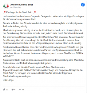Wer wollte denn an Zufall glauben, wenn am Tag vor der Sitzung, in der das Corporate Design beschlossen wird ein Facebookpost auftaucht, der das Verfahren der Entwicklung eines Corporate Design für Zeitz als „Geheimniskrämerei“ verteufelt und Sebastian Nicolai am darauffolgenden Tag mit einem Änderungsantrag aufläuft mit dem Ziel, Beratung und Beschluss zum Corporate Design von der Tagesordnung zu nehmen? Die Beratungen des Corporate Design fanden im nichtöffentlichen Teil der Sitzungen statt und es sollte am 8.10. auch im Stadtrat abschließend so beraten und beschlossen werden. Beratungsfolge und das Verfahren sind seit Monaten bekannt (rechte Spalte).