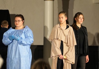 Volles Programm schon am ersten Tag. Langen Applaus gab es nachmittags in der Michaeliskirche. Die Jungendtheatergruppe Karambolage hatte mit KonfirmandInnen ein Trauerspiel von Johann Sebastian Mitternacht beeindruckend szenisch umgesetzt. Im Stück geht es um das Schicksal von Ariophilus, der gegen elterlichen Willen Soldat wurde, später aber desertierte. Mittellos geworden fiel er auf einen Barbier und Chirurgen herein, der Ariophilus aufschnitt und an dessen offenem Herzen experimentierte, woran der starb. Ein Stück vom Verlangen nach Ruhm, Grausamkeit, Moral und Gewissen.