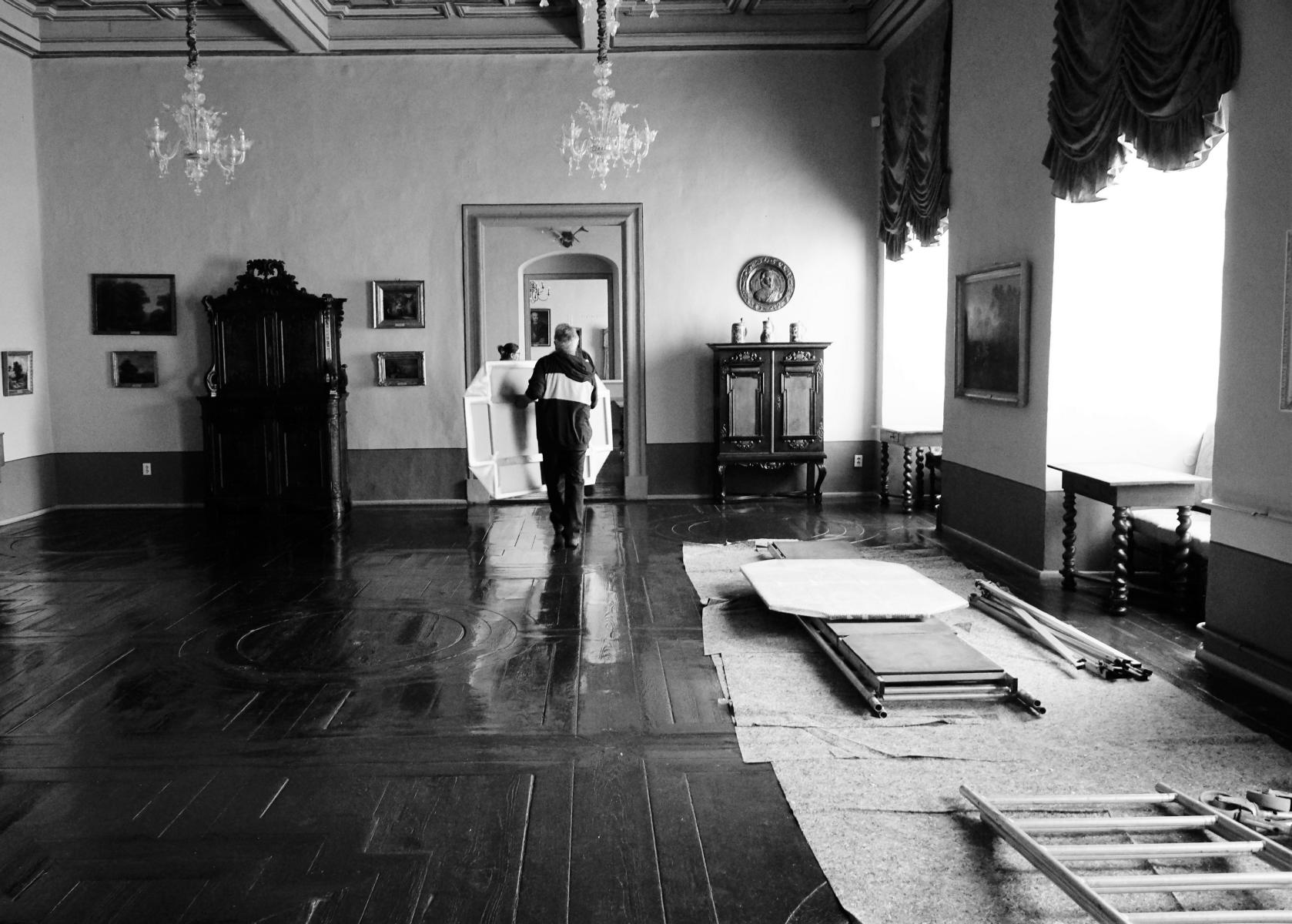 Heute (18.05.) brachte der Maler und Grafiker Hans-Christoph Rackwitz die neun großformatigen Bilder für die Decke im kleinen Festsaal des Museums. Kommende Woche werden sie eingepasst und Anfang Juni der Öffentlichkeit präsentiert.