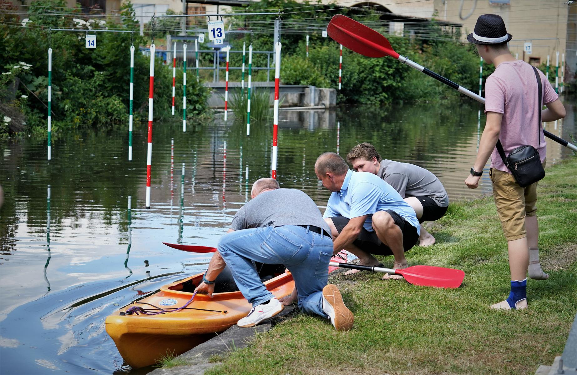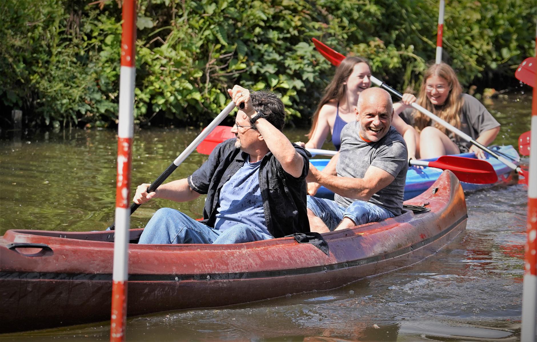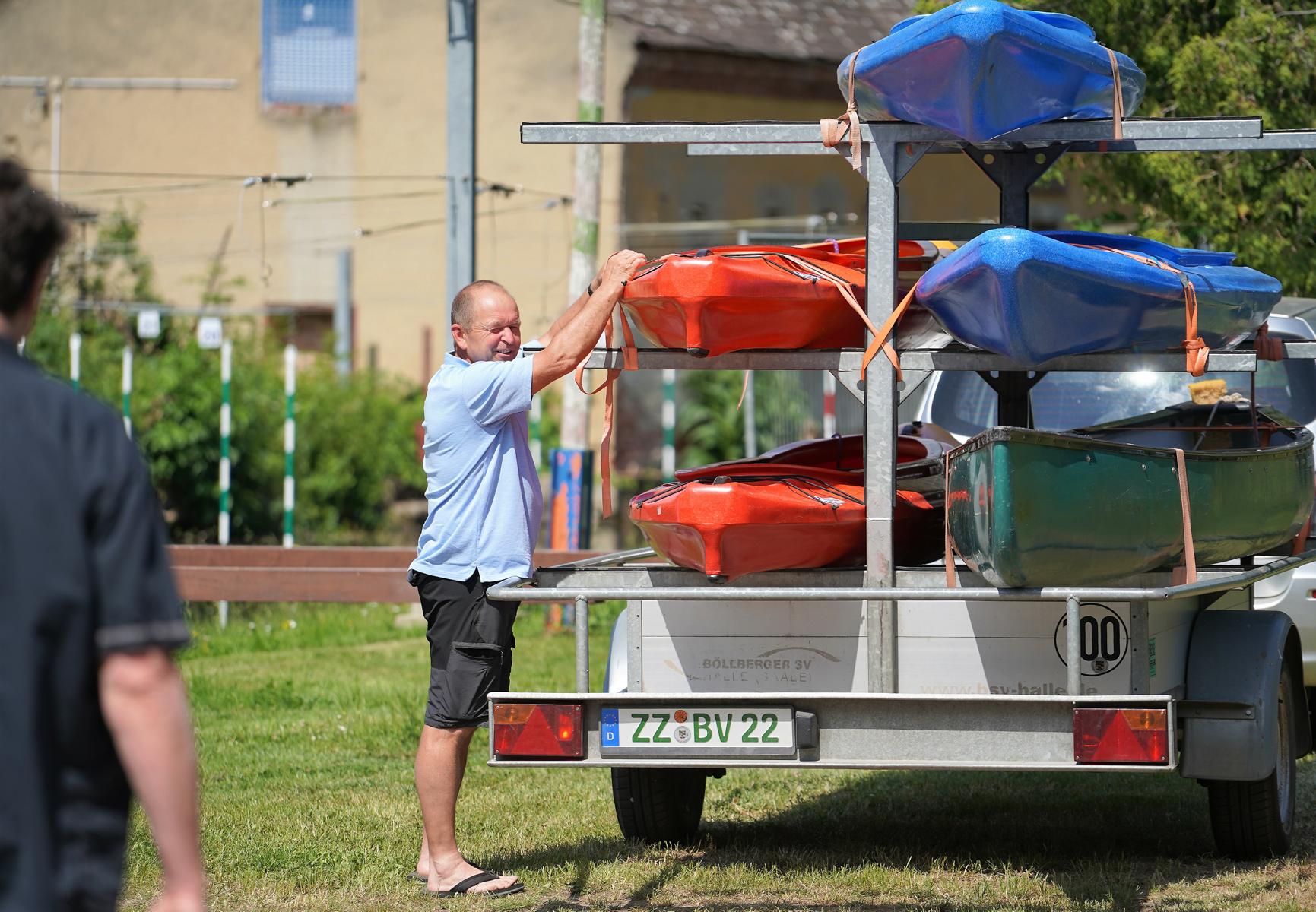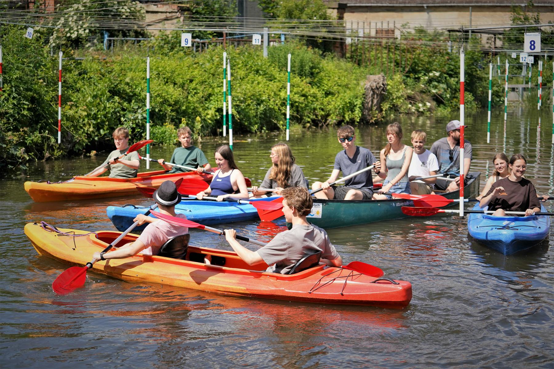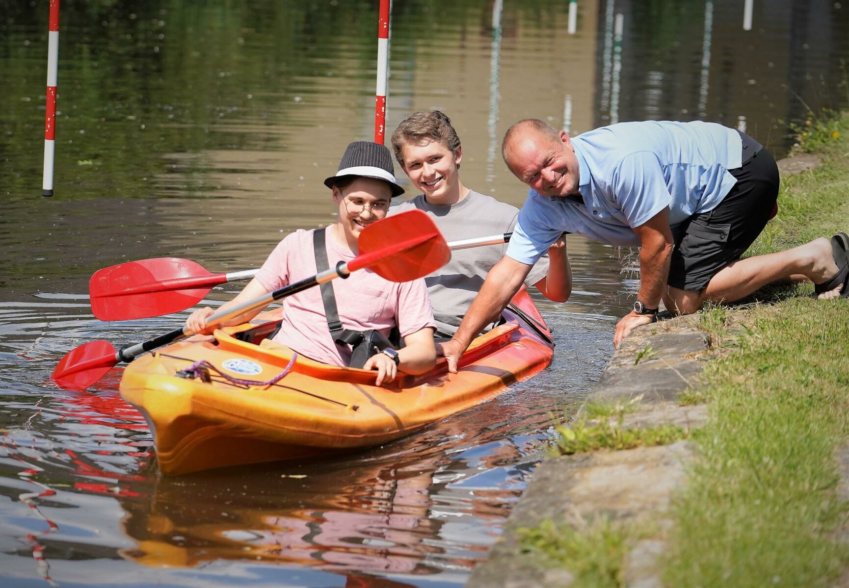 Hier am Bootshaus der Zeitzer Kanuten versuchen die Ausflügler, sich für ein Pressefoto zu formieren. Was für Michael Trummer selbstredend kein Problem ist, wird für unerfahrene Schüler und Lehrer zur kleinen Belustigung. Für einen kurzen Moment wird es dann reichen für ein Foto. Dann machen sich Mühlgrabenbezwinger hinter den Bäumen unter die kleine Brücke bückend davon, flussaufwärts eine lustige Bootfahrt zu erleben.