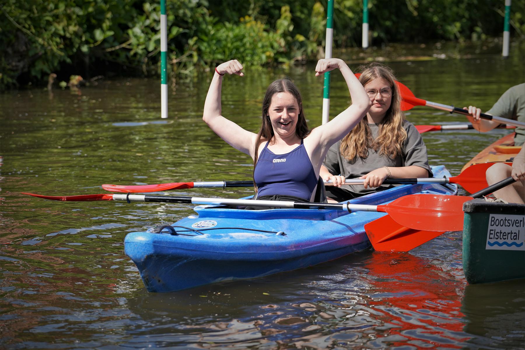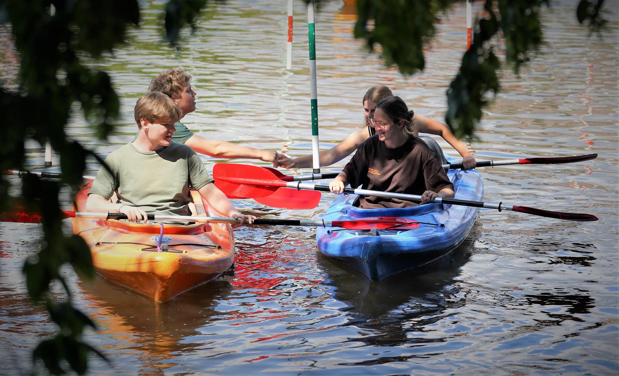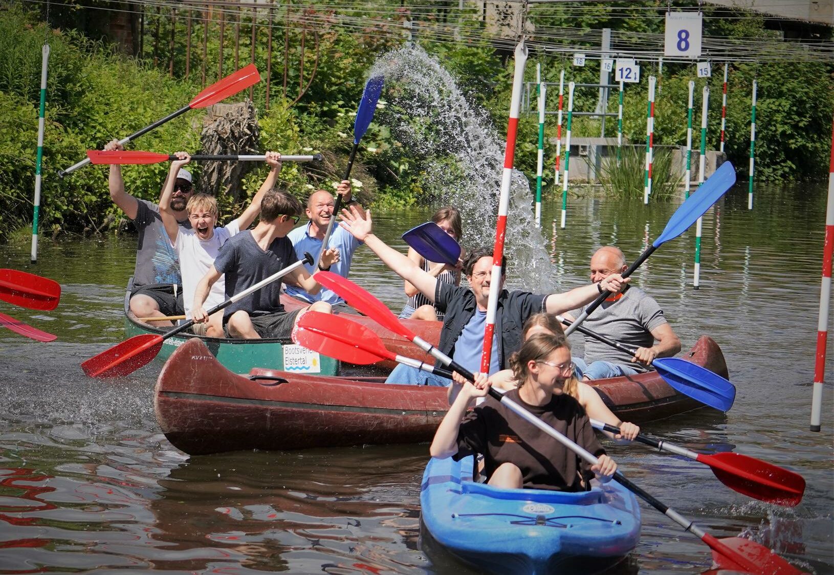 Damit ein bisschen Stimmung aufkommt schaukelt Michael Trummer das Boot mit den beiden Jungs und macht kräftig Wellen. Später wird er mit seinem Paddel Wasser aufnehmen und einen Bogen über die Boote schlagen. Na bitte, die Truppe jubelt als das Wasser auf sie nieder prasselt. So soll es sein bei dem kleinen Ausflug der Schüler aus Zeitz mit ihren Gästen aus der Partnerstadt Prescott, Arizona. Um Spaß auf dem Wasser zu haben, brauchst du eben nicht unbedingt einen wilden Colorade River, es genügt auch ein seichter Mühlgraben.