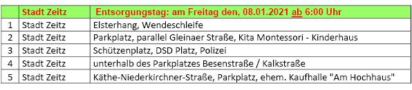 Nachfolgende Sammelplätze werden zum feststehenden Termin/Entsorgungstag am Freitag den, 08.01.2021 ab 6:00 Uhr zur Sammlung angefahren.
