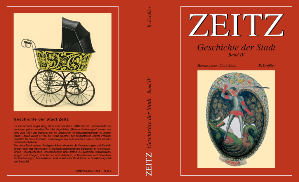„Es war ein sehr langer Weg, bis in Zeitz seit der 2. Hälfte des 19. Jahrhunderts Kinderwagen gebaut wurden…“ beschreibt der Klappentext. Und: „Der vierte Band unserer Stadtgeschichte beschreibt die Veränderungen und Entwicklungen nach der Reformation (ab 1564) in politisch-administrativen Bereichen, in Gerichtsverfahren, Hexenprozessen, Urteilsfindungen und Strafen, in Epidemien, Klimaschwankungen und Kriegen, in Ackerbau, Gartenbau und Viehzucht, in Handwerken und Gewerben, Zünften/Innungen, Manufakturen und industrieller Produktion, in Bevölkerungszahl und Stadtbild“.