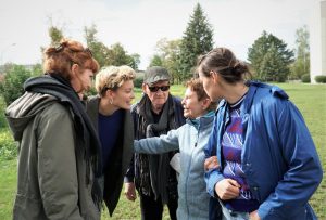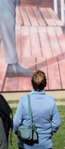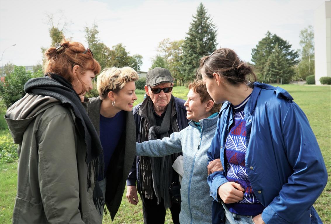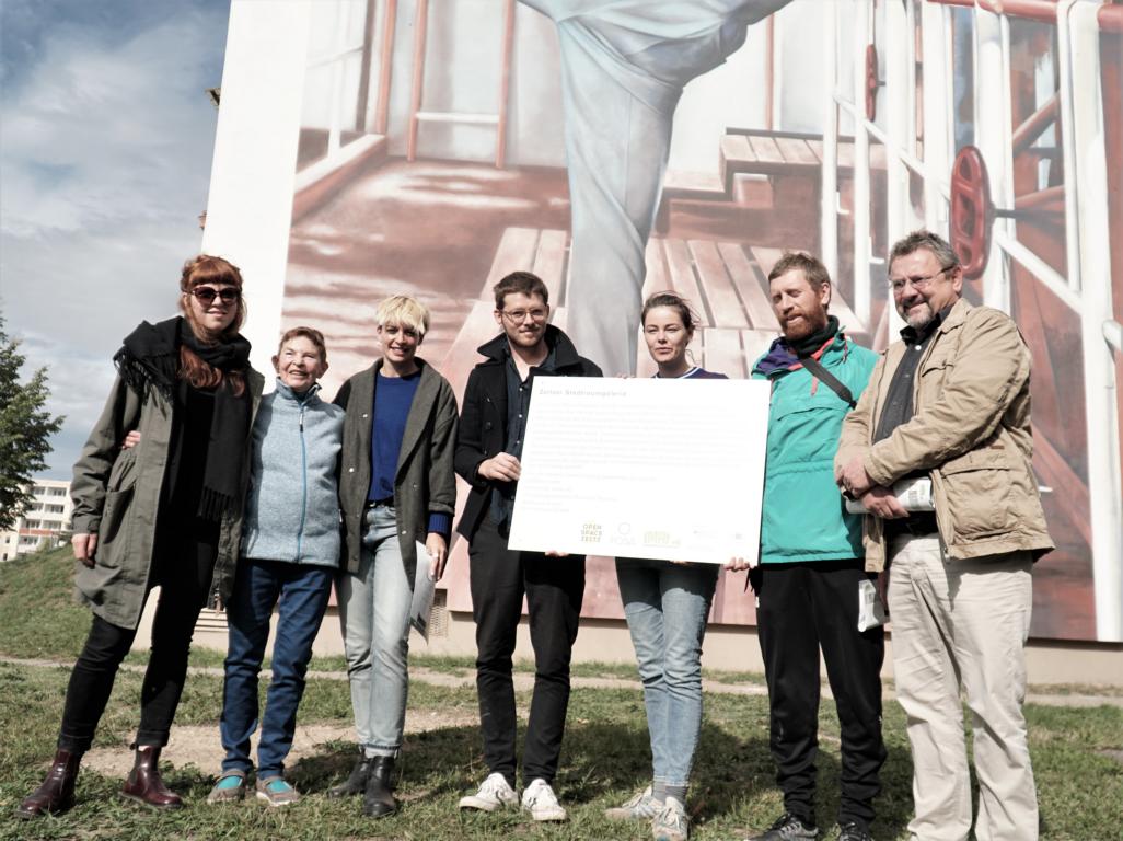 Christel Bodenstein hatte sich so sehr gewünscht, einmal den Menschen zu begegnen, die das Wandbild „Die Tänzerin“ realisierten. Am Sonntag lud „OPEN SPACE ZEITZ zum Pressetermin dorthin. Und alle waren sie gekommen. Die beiden Künstlerinnen Theresa Schulz und Vera Lötzsch, Philipp Baumgarten und Ina Tuscher von OPEN SPACE, AnwohnerInnen, einige von Kloster Posa, die Presse. Welch schöne Begegnungen. Karsten Baczsa ließ sich den Termin nicht nehmen. Als Chef der Wohnungsgenossenschaft 1. Mai hatte er die Wand bereit gestellt und übergab als herzlichen Willkommensgruß ein Präsent. Er freue sich sehr, dass sie hier sein. Das ging denn allen anderen wohl auch so. Einschließlich Christel Bodenstein selbst und ihrem Mann. Auf der Heimfahrt erzählt sie, wie sehr sie auch der Besuch von Anwohnern gefreut habe, weil das zeige, wie das Wandbild angenommen würde dort, wo es täglich zu sehen ist.