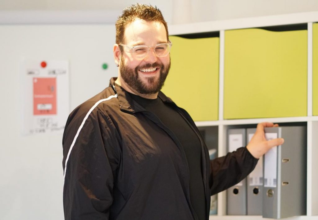 Dieser Mann hat gut Lachen. Wenn er in seine Bücher guckt. Aber auch so. In den eben eröffneten Räumen zwei Etagen über seiner Physiotherapie lächeln dich frische Farben an. Wände, Regale und restliches Interieur strahlt aus, was er beruflich macht – Entspannen, Auftanken, Gesund werden.