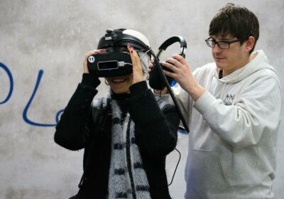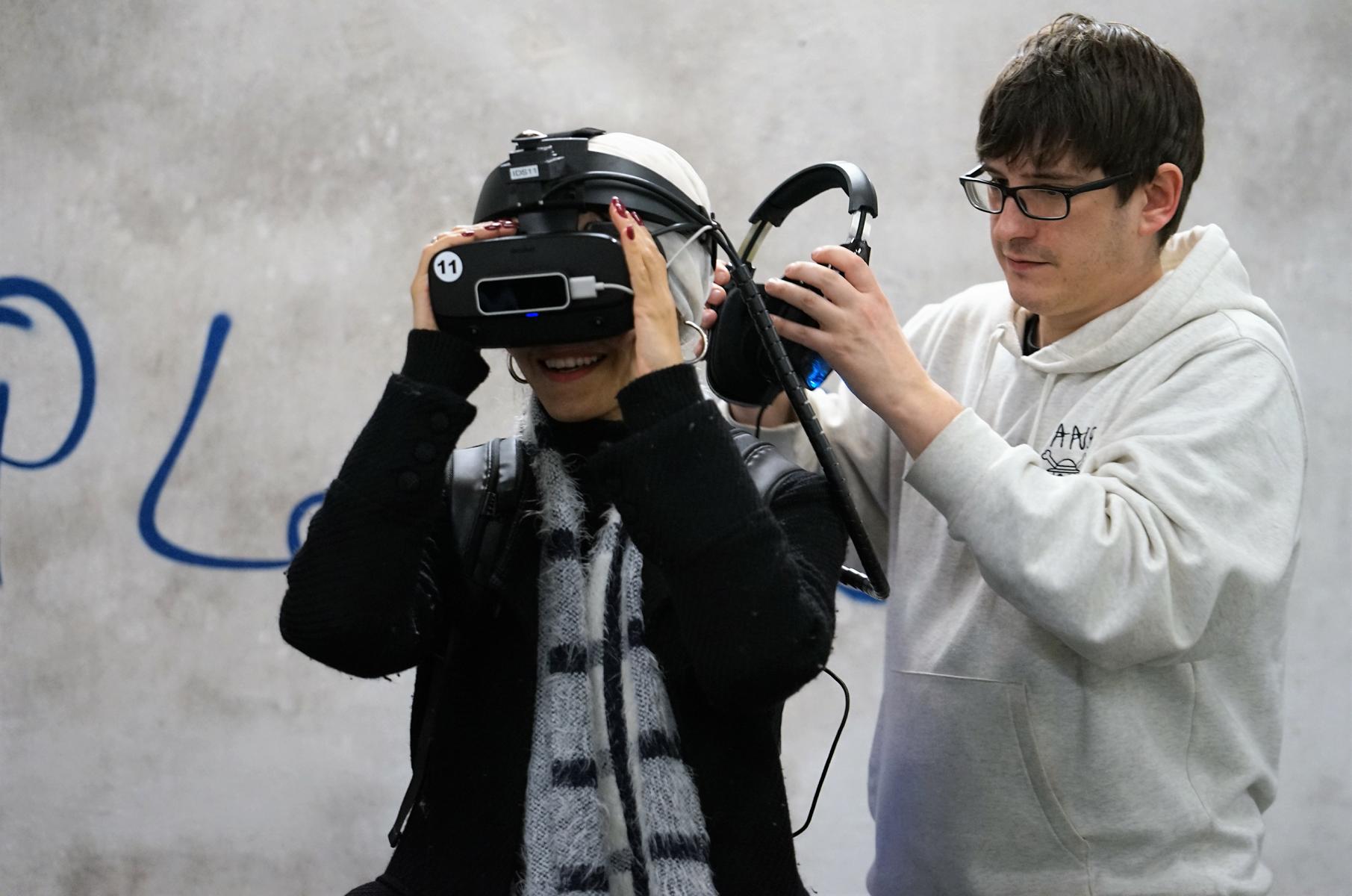 Das erste „wow“ des Tages gabs in der Nudelfabrik, gleich am Morgen nach der Ankunft der erste Ort ihres Besuches. Als sich nach dem noch etwas düsteren Treppenhaus die Tür in der provisorischen Zwischenwand öffnete: wow. Der angestaubt belassene Industriecharme und das moderne Interieur, das gefiel. Das und frisch duftender Kaffee, beste Voraussetzungen für ein erstes Gespräch über die Nudel, ihre Geschichte, was mit ihr passierte und noch passieren soll. Dazu konnte Martina Kuhaupt, Leiterin des Digitalisierungszentrums DZZ einiges erzählen. Was hier  passiert auch live zu erleben, dafür sorgte Maximilian Salzmann. Der IT-Experte aus dem DZZ führte ins VR-Zentrum unterm Dach der Nudel, wo die Gäste mit VR-Brille und zugehörigem Rechnerrucksack einmal das virtuelle Training für Feuerwehrleute nachempfinden konnten. Leichtes Staunen und gelegentliches Stolpern inklusive. Die beim DZZ für den Öffentlichkeitssupport zuständige Jenny Gräfe hielt diese und jene Szene für ihr Team im Bild fest. Wir natürlich auch:
