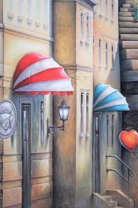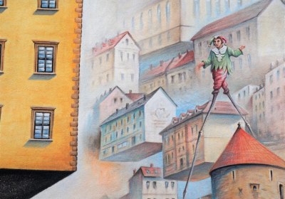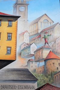 Nein, genauer hingesehen blickt dich nur Herzog Moritz an, der Blick der beiden anderen geht in die Ferne – In die Zukunft? Dorthin, in die Zukunft, wohin sich auch die Menschen auf der riesigen Treppe im Zentrum des Bildes zu bewegen? Familien, Kinder, ein Zeitungsleser und ein Herr mit Pickelhaube gehen, angeführt von der Zucker-Susi, scheinbar beschwingt und zuversichtlich dem Licht entgegen. Doch Achtung, der stadtbekannte Herkules scheint am Wanken, wie manches, das es noch zu tun gäbe.