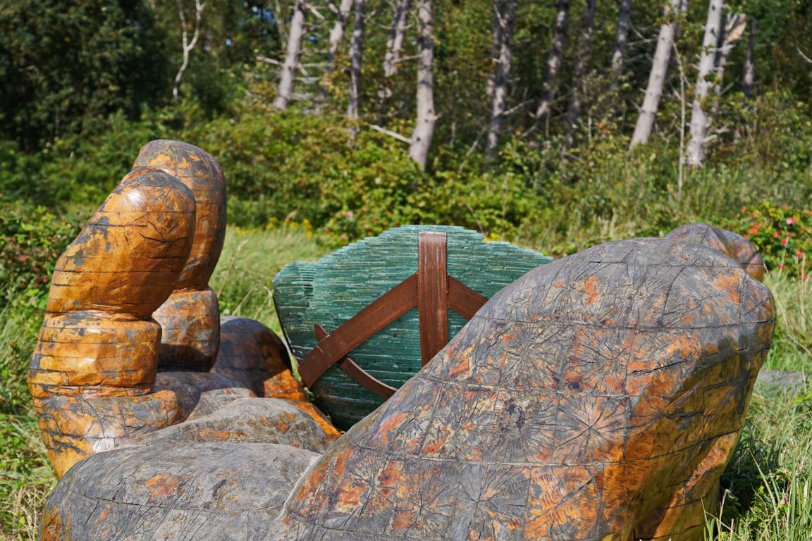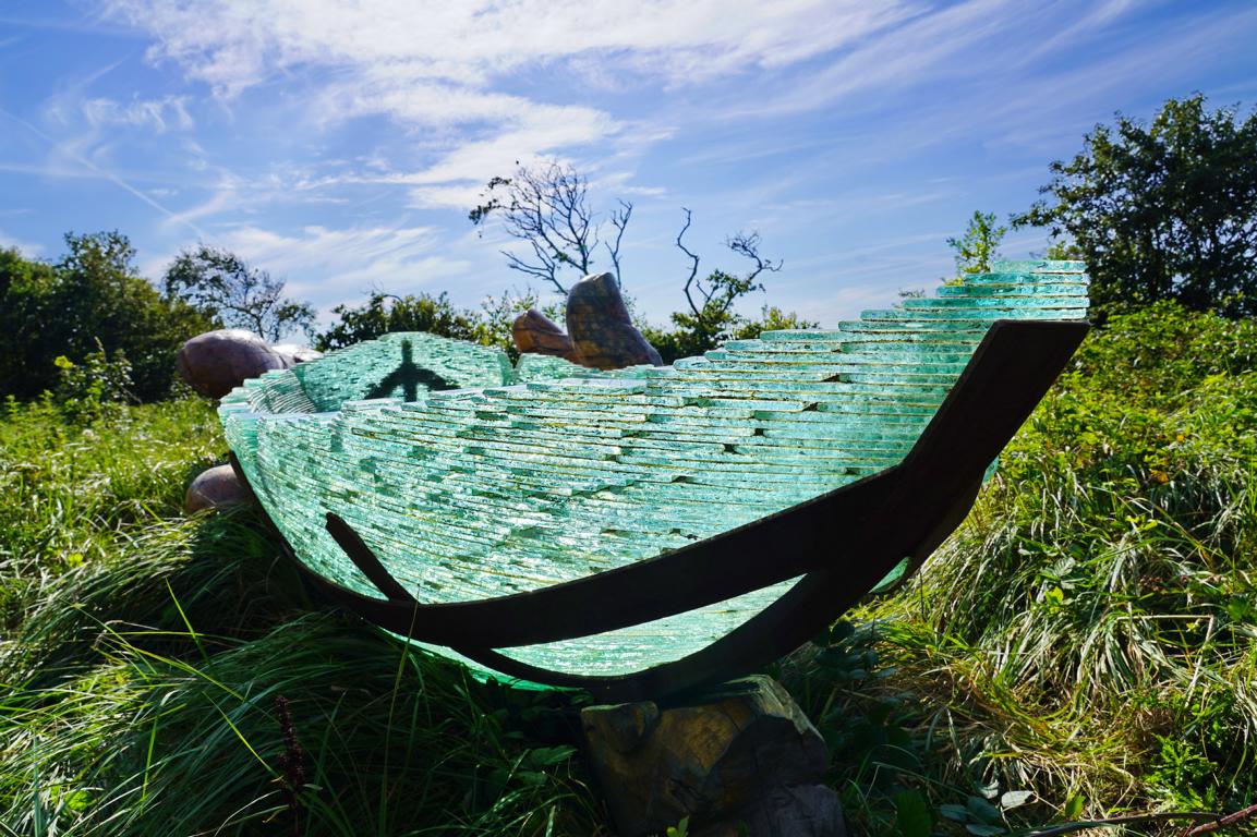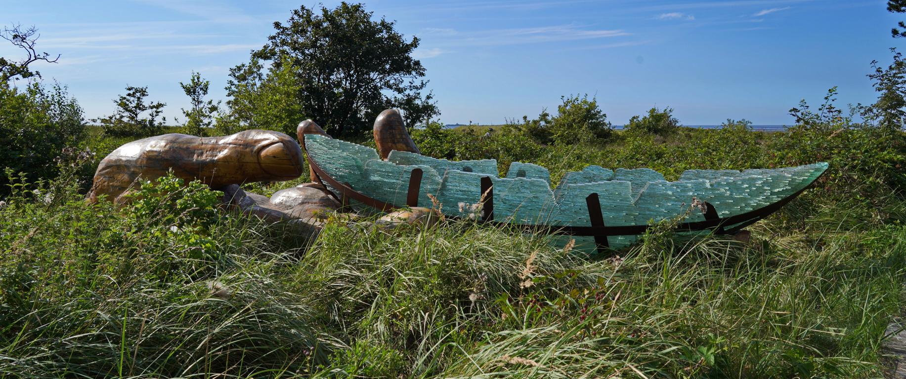 Wie eingewachsen, wie seit halben Ewigkeiten mit der Natur verwoben liegt die Glasarche im Gras. Umgeben von Wind und Gräsern wird das Kunstwerk am nahen Wattenmeer bis in den Oktober hinein die Menschen erfreuen. Unversehrt hat die Glasarche 3 ihre kleine Wanderung von St. Peter Ording nach Cuxhaven überstanden.