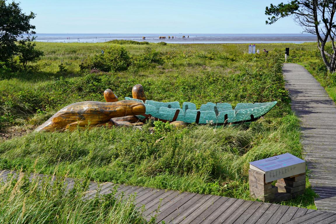 Über das Besucherzentrum lesenwir „die informative Ausstellung im architektonisch eindrucksvollen Holzbau zeigt alles Wissenswerte über das Weltnaturerbe Wattenmeer. Watt, Salzwiese, Geestkliff oder Küstenheide können bei naturkundlichen Führungen erlebt werden. Die weite Wattlandschaft ist zu jeder Jahreszeit ein besonderes Naturerlebnis.“ (Quelle: Besucherzentrum).