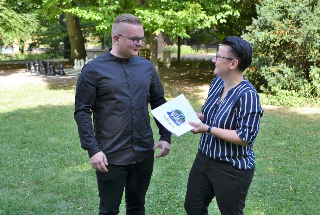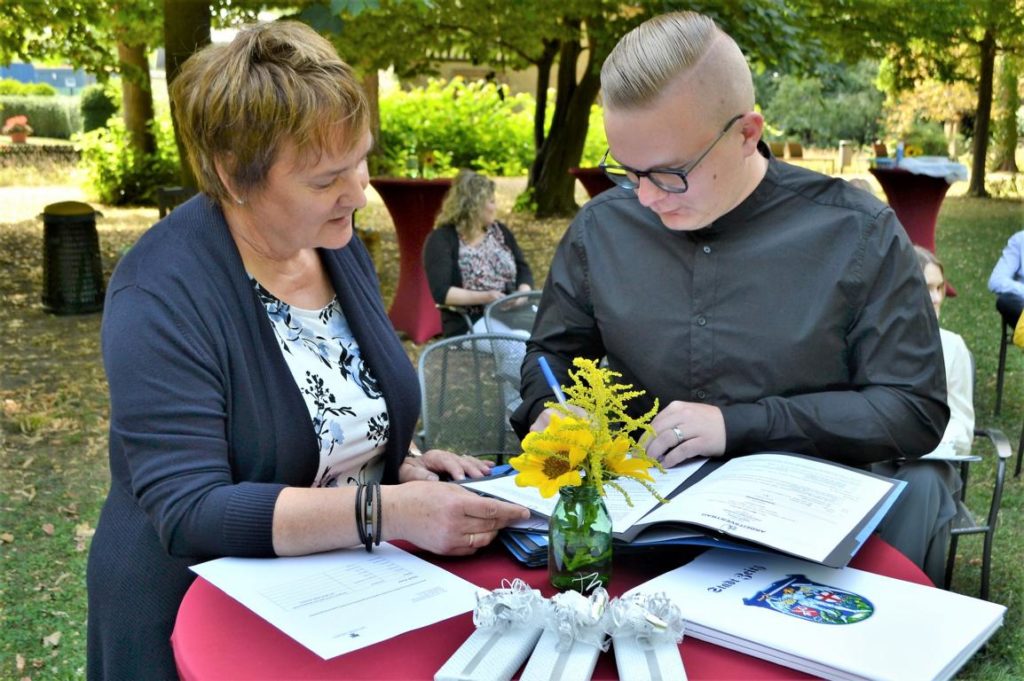 Zeitz, 29.07.22 / Strahlende Gesichter bei strahlendem Sonnenschein heute im Rossnerpark. Junge Fachkräfte erhalten ihre Abschlusszeugnisse nach erfolgreicher Ausbildung bei der Stadt Zeitz. Vier junge Menschen unterschreiben ihren Arbeitsvertrag mit der Stadt Zeitz. Einer davon ist Marcel Iwohn. Gerade bekommt er die Glückwünsche von Bürgermeisterin Kathrin Weber zum erfolgreichen Ausbildungsabschluss, wartet schon Ausbildungleiterin Steffi Pinkert mit dem Arbeitsvertrag (siehe Fotos).